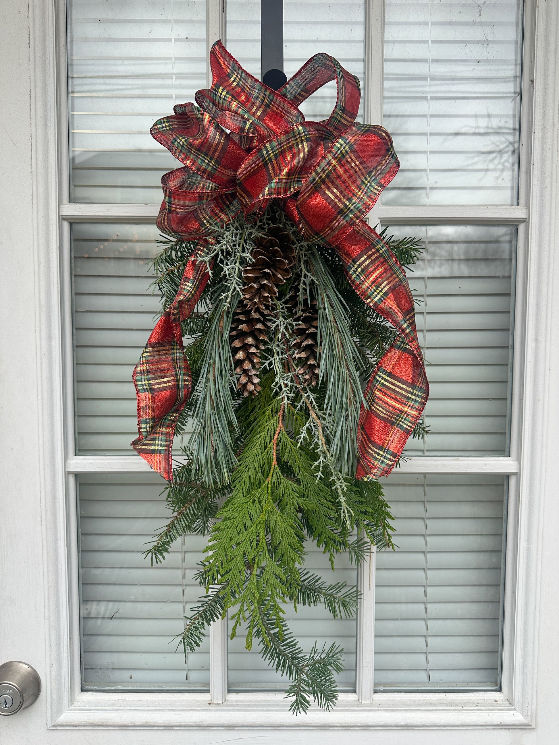 Welcome guests with festive charm! This evergreen door swag brings the magic of the holiday season to your door, blending fragrant frasier fir, pine, cedar, and cypress branches into a lush, layered arrangement. Bright red winterberries peek through the greenery like tiny jewels, while a festive bow adds a cheerful finishing touch. Perfect for creating that cozy, enchanted holiday atmosphere that makes everyone smile the moment they arrive.