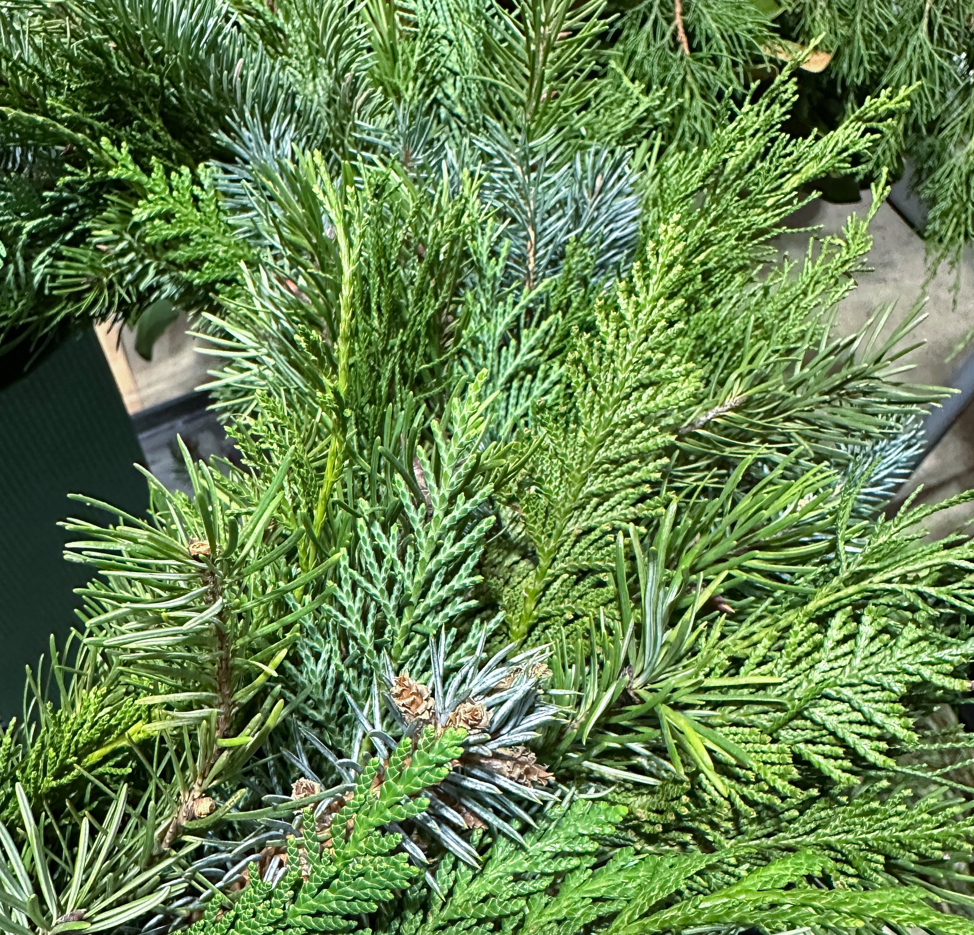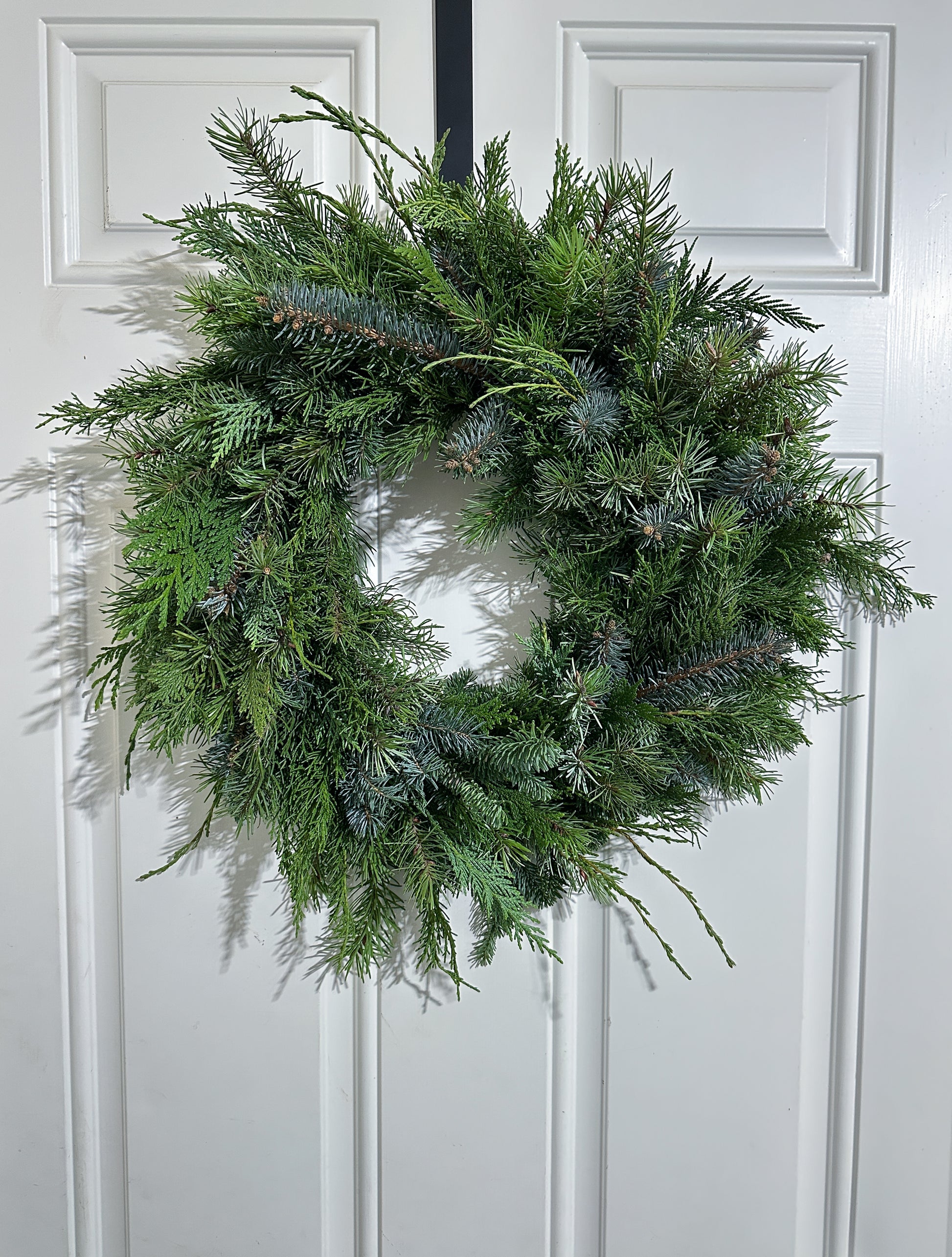 Our Just the Greens Wreath is a delightful mix of nature's finest evergreen foliage. This wreath features a lush blend of fir, juniper, cedar, and other assorted greens. Perfect for those who adore the authentic beauty of evergreens without the fuss of extra embellishments!